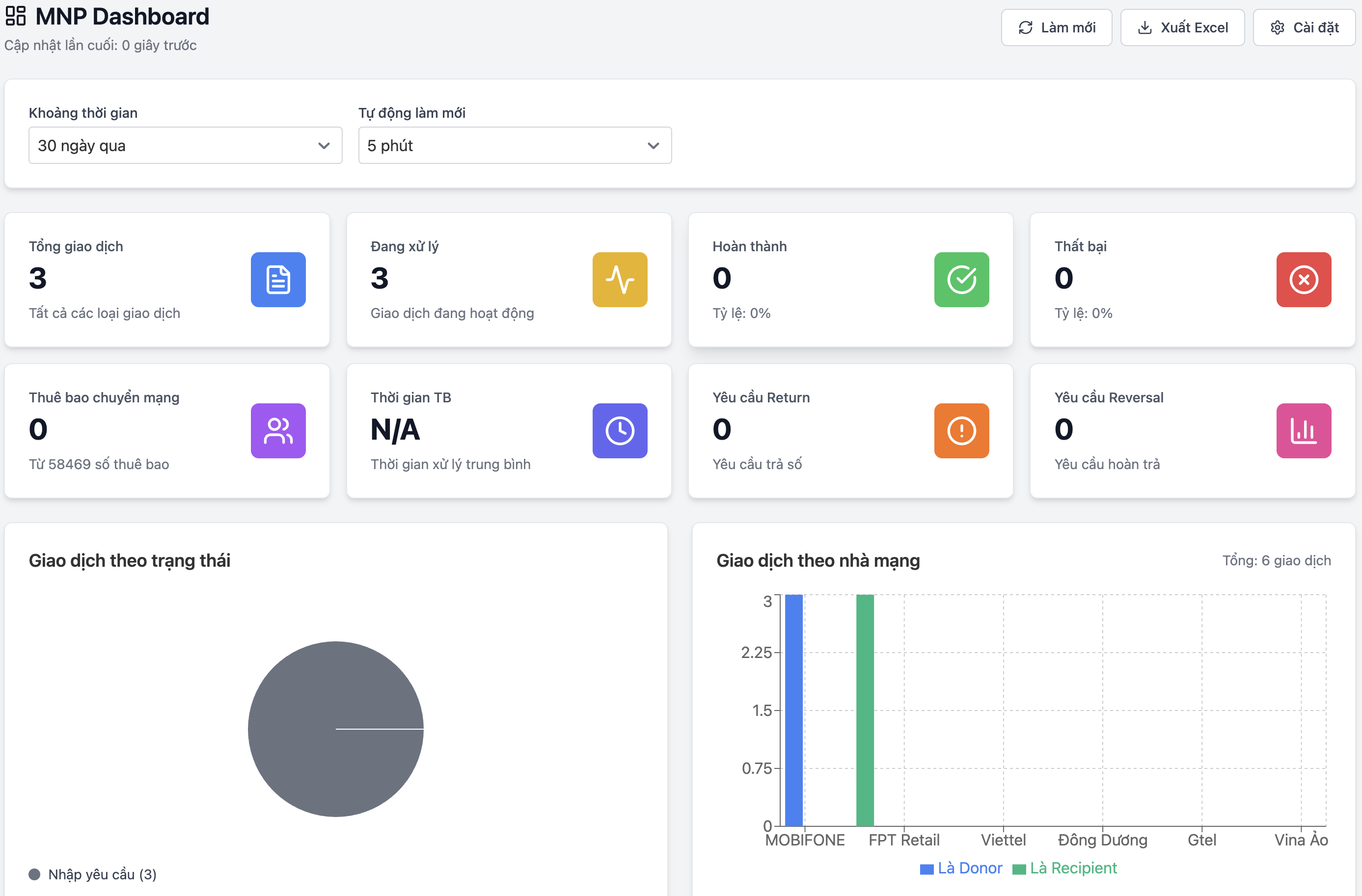 Hệ thống quản lý phía nhà mạng: tạo & theo dõi NPR, đồng bộ với lớp gateway, tìm kiếm theo số, trạng thái, bản ghi; quản lý thuê bao, lịch sử; xử lý ngoại lệ dạng trả số, hoàn tác; đồng bộ dữ liệu với NPC/điều hành; xem log request/response & phân tích thời gian. Dashboard: tổng giao dịch, phân bổ trạng thái, cảnh báo vượt SLA, xuất dữ liệu phục vụ vận hành. Phân quyền theo vai trò (RNO, DNO, nội bộ).